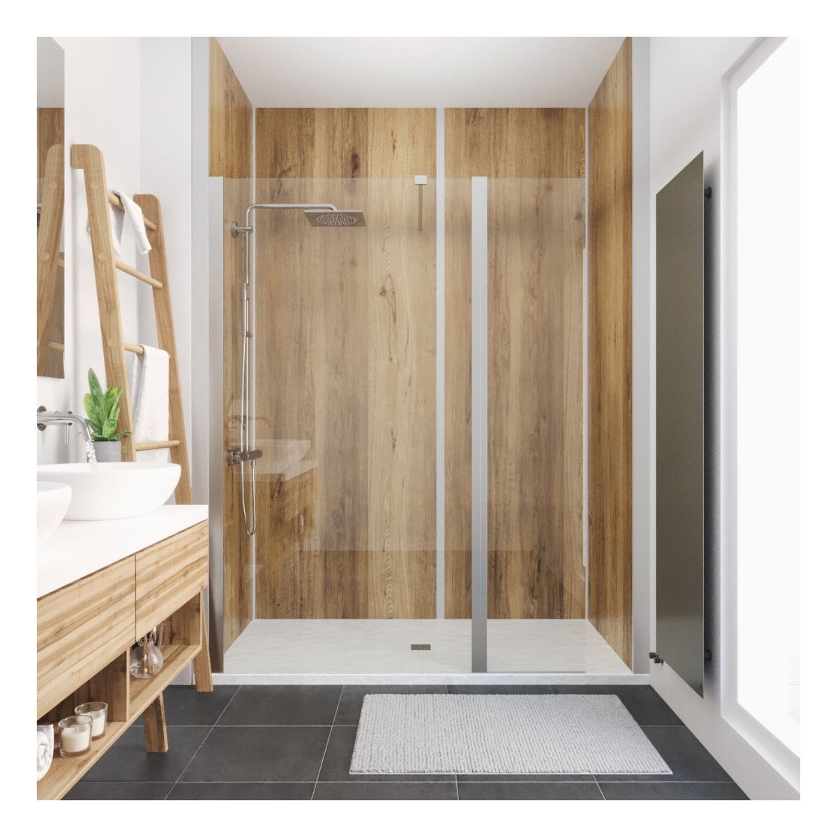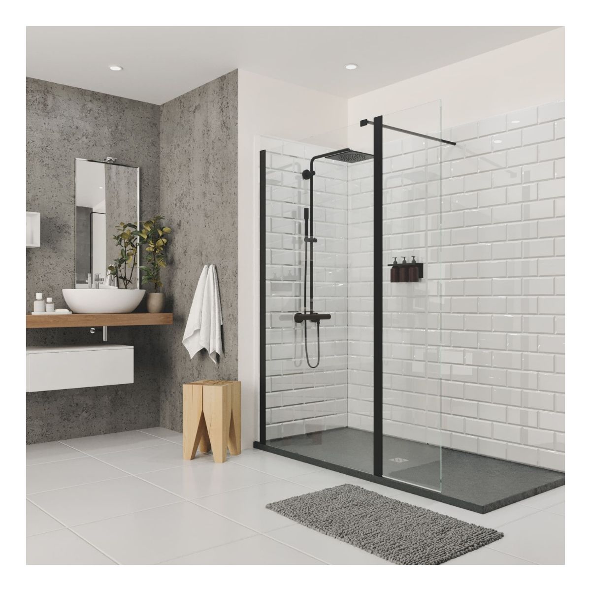 Chaque aménagement est conçu sur mesure, selon la configuration du logement, les matériaux choisis et les options retenues (parois vitrées, sièges relevables, finitions murales, etc.).