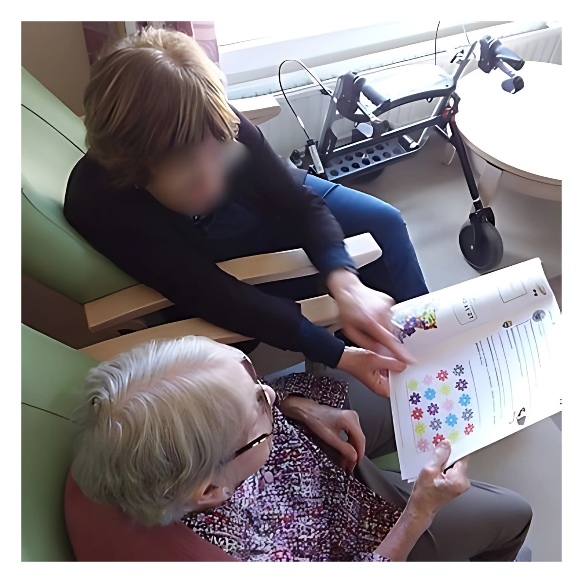 • 🟪 Parcours VIOLET : conçu pour les personnes présentant des troubles cognitifs modérés (à titre indicatif : score MMS entre 15 et 19). Il propose des exercices centrés sur la mémoire, le langage, la concentration et la contextualisation dans le temps et l’espace — autant de repères précieux pour maintenir une certaine autonomie dans les gestes du quotidien.