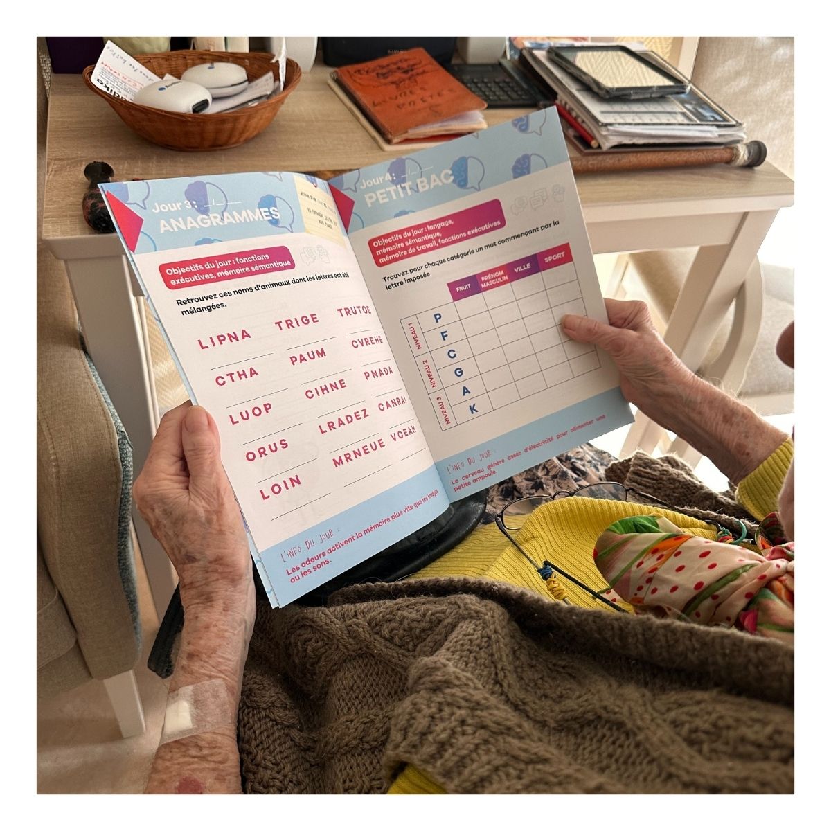 On peut le feuilleter avec ses enfants ou petits-enfants le week-end, pour un moment de jeu et de complicité, ou encore le découvrir avec un(e) professionnel(le) (auxiliaire de vie, psychomotricien, accompagnant…), qui peut en faire un support ludique d’échange et de stimulation.