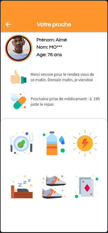 L’interface est ludique, intuitive et visuelle : il suffit de cliquer sur les icônes correspondant aux actions effectuées (repas, toilette, promenade, etc.) et , puis de parler à voix haute si l’on souhaite ajouter un commentaire ou un ressenti.